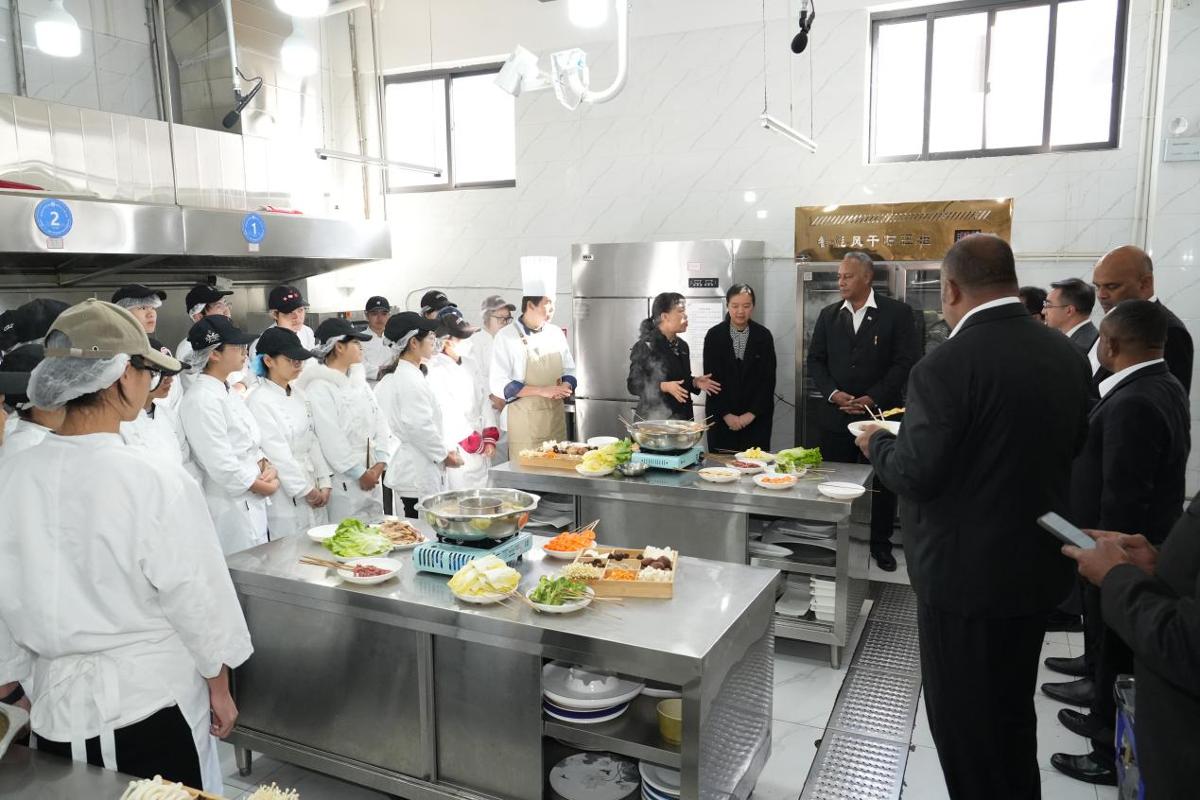 随后,代表团一行移步至数字化烹饪实训中心,观摩了中餐烹饪实训教学课堂,沉浸式体验了美食模拟夜市。期间,代表团对我校将传统烹饪技艺与现代数字化教学相结合的模式表示高度赞赏。