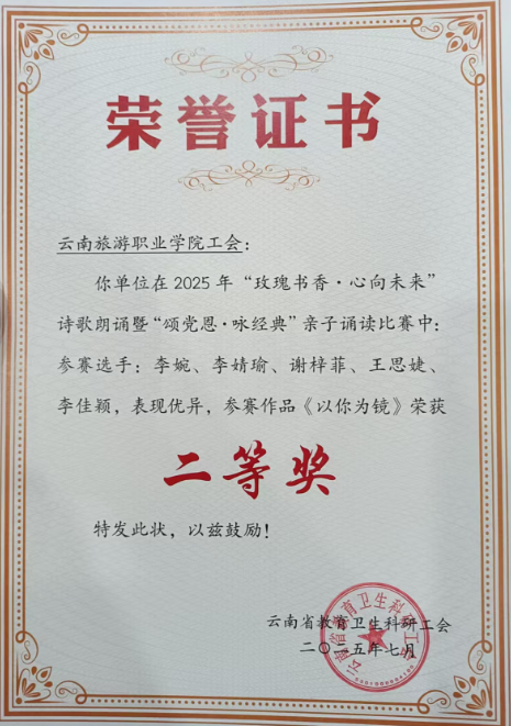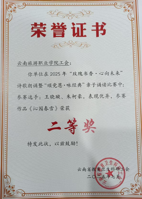 7月15日至17日,由云南省教育卫生科研工会主办的“玫瑰书香·心向未来”诗歌朗诵暨“颂党恩·咏经典”亲子诵读比赛在五华区青少年宫成功举办。我校教师李婉、李婧瑜、谢梓菲、王思婕、李佳颖朗诵作品《以你为镜》在“玫瑰书香·心向未来”项目中披荆斩棘,荣获二等奖;教师王晓璇作品《沁园春·雪》在“颂党恩·咏经典”亲子诵读比赛中荣获二等奖。