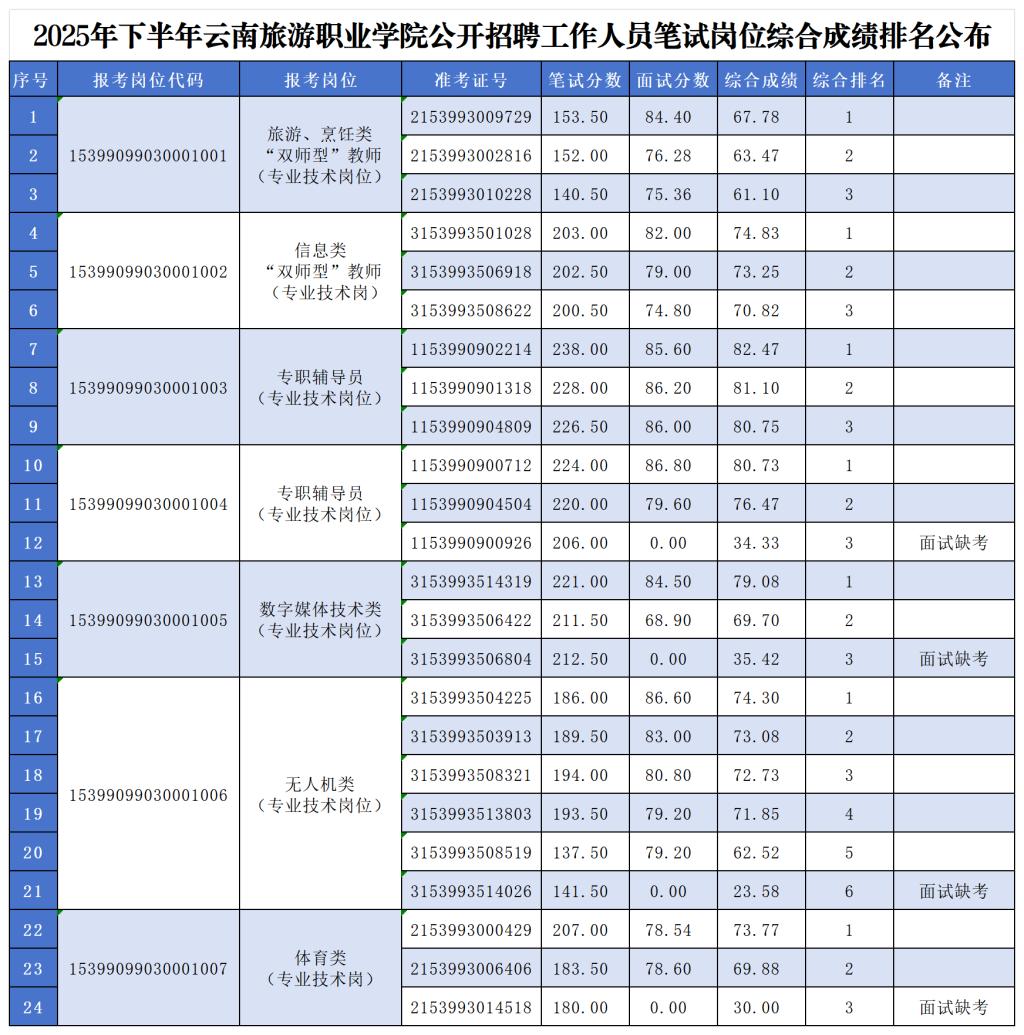 根据《2025年下半年6163银河线路检测中心公开招聘人员公告》等有关规定及相关要求,6163银河线路检测中心2025年下半年公开招聘人员笔试岗位面试测评工作已完成,面试测评成绩已当场公布,现将综合成绩予以公布如下。