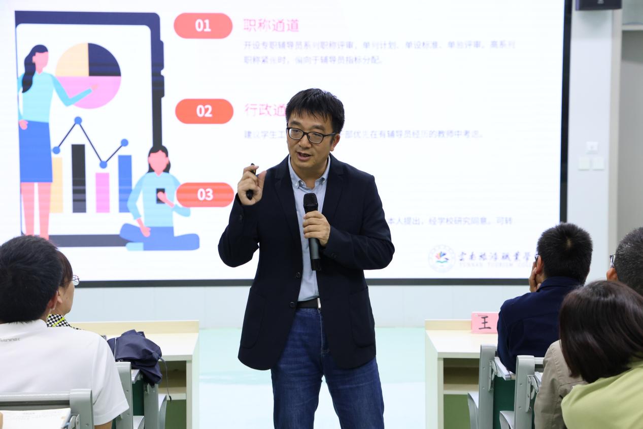 推进会同期举办了专题培训,副院长何树称聚焦专职辅导员队伍的建设开展实务讲座。讲座围绕专职辅导员的角色定位、怎么做好一名专职辅导员以及辅导员工作机制等内容展开,深入探讨了学生事务管理与价值引领的协同机制,为参会人员带来了丰富且实用的知识。