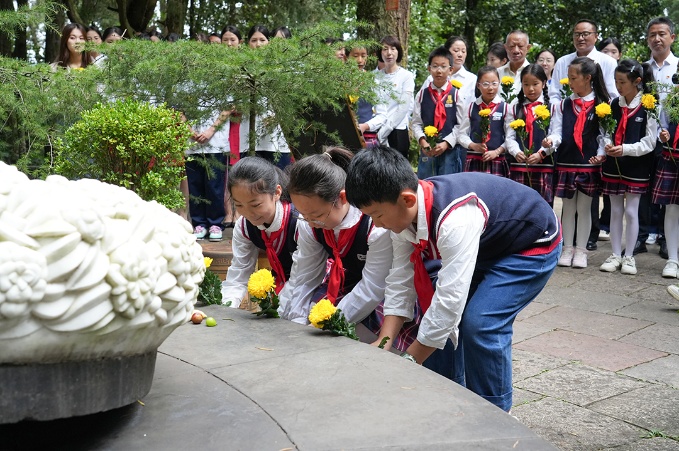 在《义勇军进行曲》高亢激昂的乐声中,在场全体师生一一向聂耳墓敬献鲜花,表达对伟大中国革命音乐家的追思与致敬。