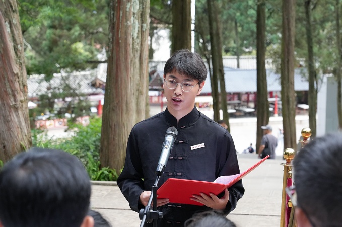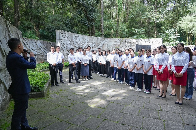 在西山聂耳墓前,我校导游2403班刘仁磊同学向在场师生介绍了聂耳的生平与《义勇军进行曲》的创作历程及其伟大意义,帮助师生们深入学习国歌背后的故事,其所传达的爱国感召与斗争精神。