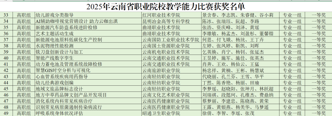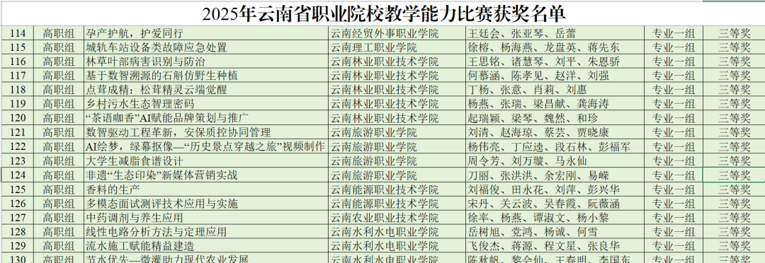 近日,据2025 年云南省职业院校教学能力比赛(高职组)结果公布,我校资源工程学院两支教师团队斩获佳绩。其中,杨忠祥、黄楠、王彬、杨慧斌团队凭《智慧 GIS 时空分析与可视化》获专业组一等奖;刘清、赵海琼、蔡芸、贾晓康团队以《数智驱动工程革新,安保质控协同管理》获专业组三等奖。