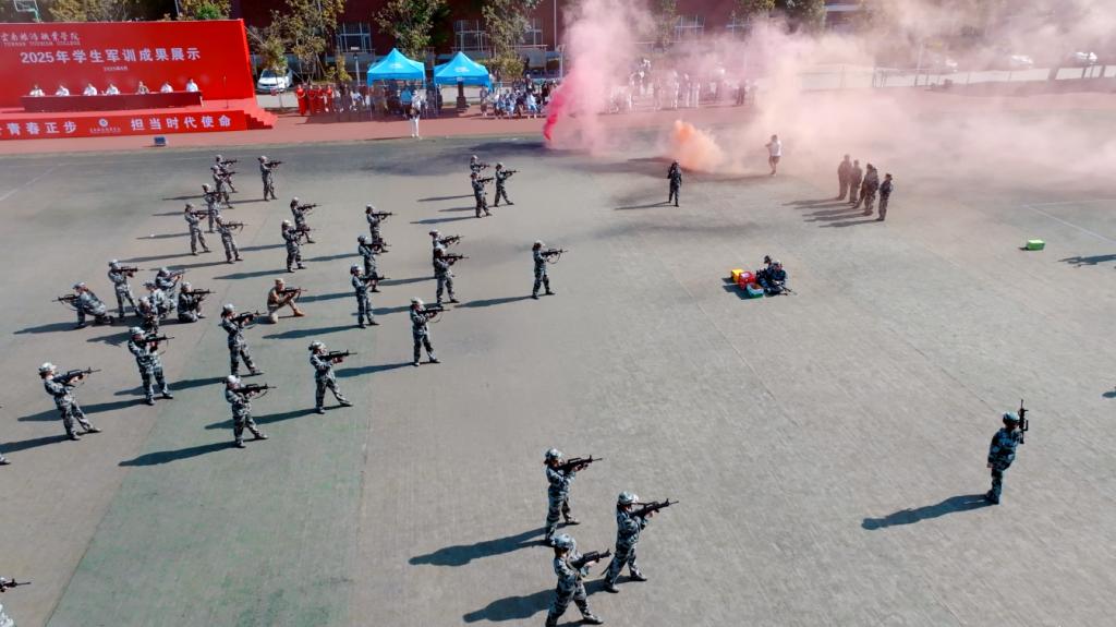 在军训科目汇报环节,各类汇报演出亮点纷呈:刺杀操锋芒尽显,防爆棍虎虎生威,捕俘刀招招利落,啦啦操活力跳跃,手语舞传递温情,擒敌拳花样队列编排巧妙;战术技能应用与解救人质演练中,新生们配合默契、反应迅速,尽显实战风采,将21天的军训成果完美呈现。
