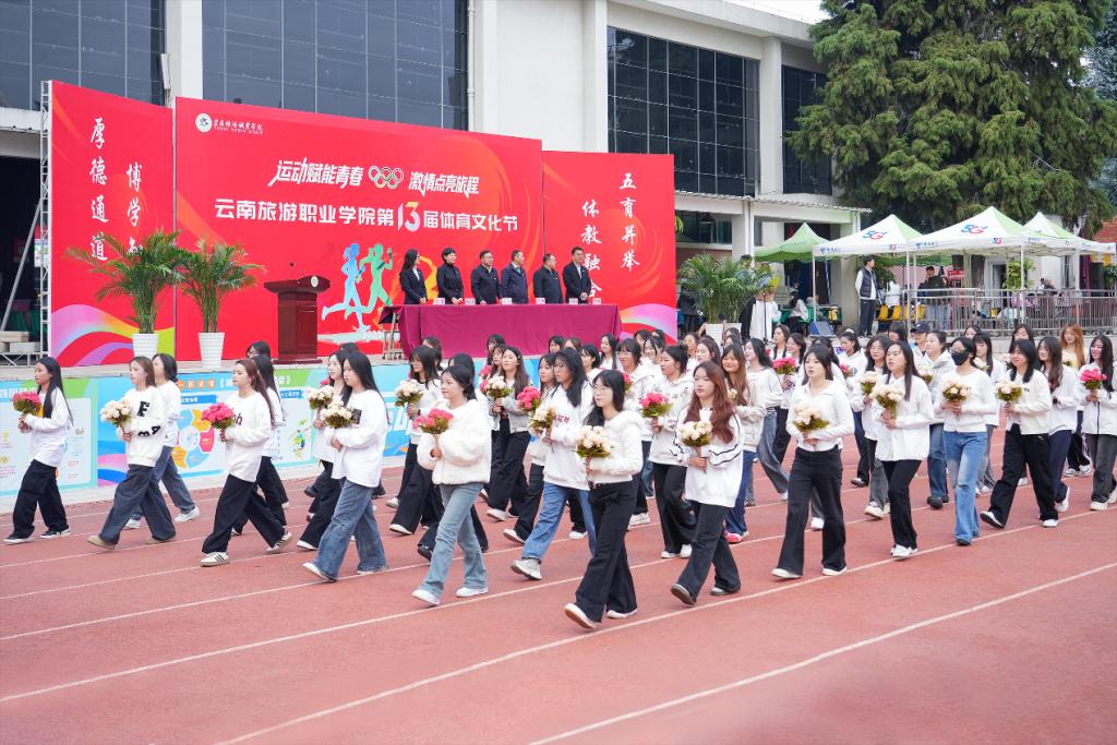 首先入场的是鲜花队与红旗队。朝气蓬勃的鲜花队队员手持五彩缤纷的花束,向全场挥洒着青春的活力与热情;紧随其后的红旗队队员则高举红旗,步伐整齐划一,为整个赛场渲染出庄严而热烈的氛围。