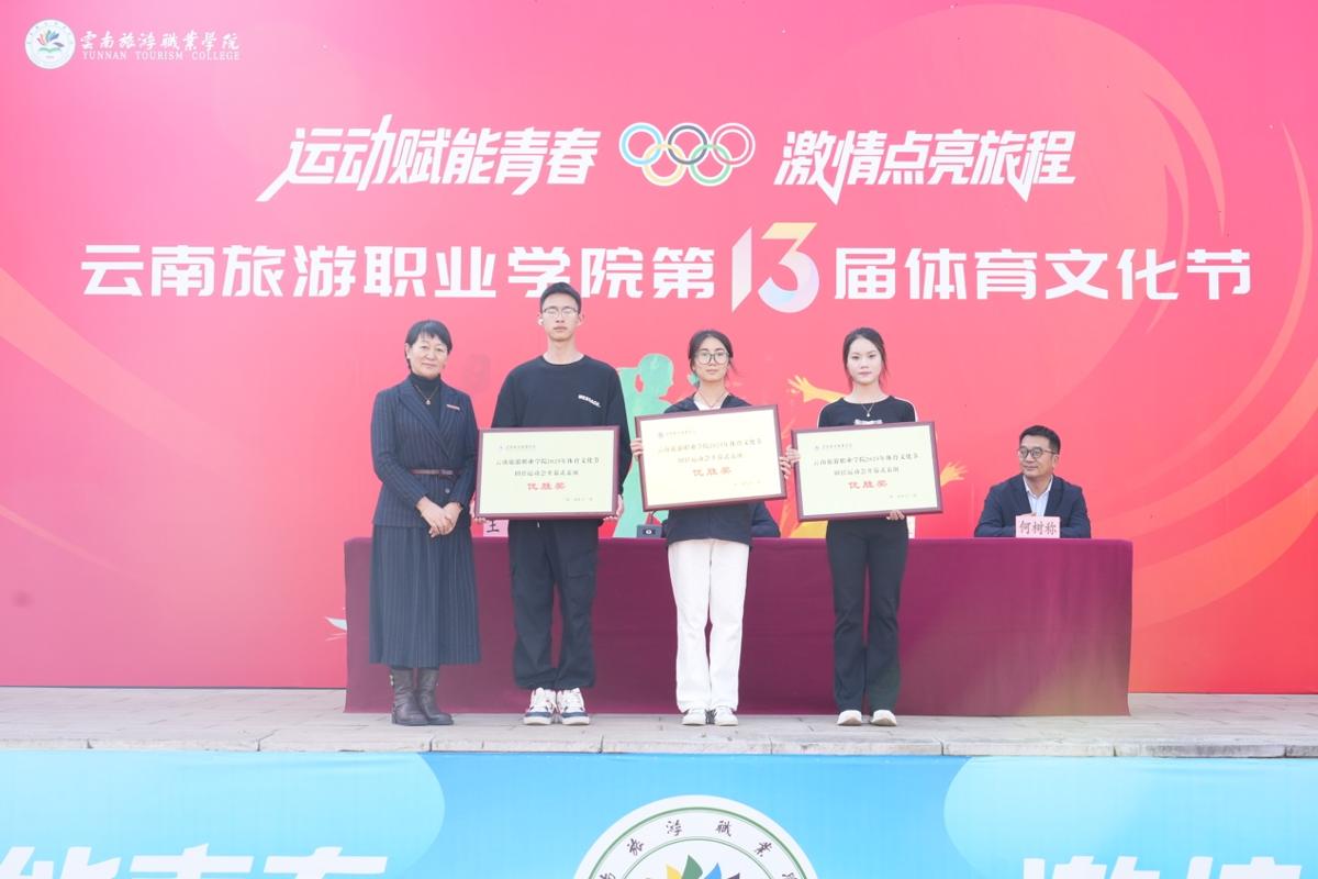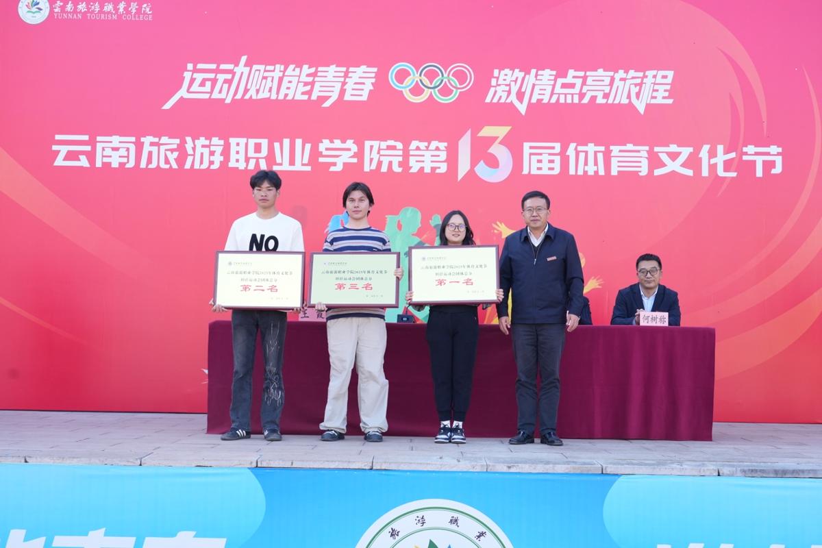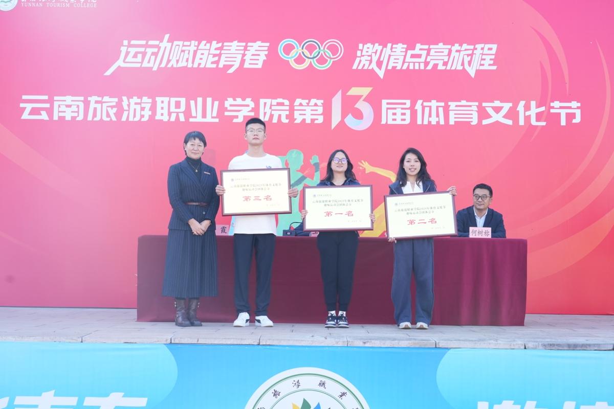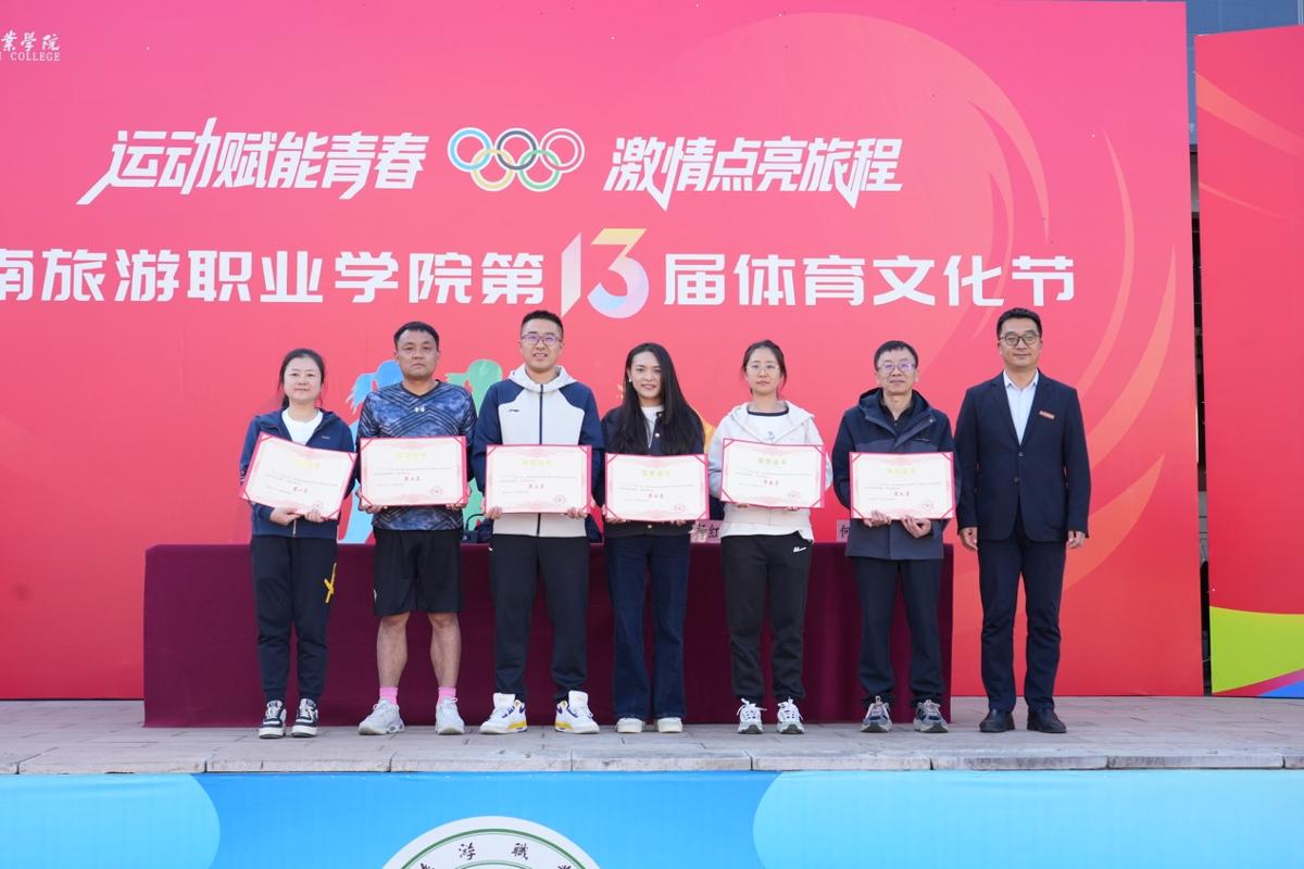 我校领导为本次运动会的获奖团队颁奖。教职工比赛中,教务工会小组摘得桂冠,荣获团体总分第一名。学生比赛中,烹饪学院拔得头筹,在田径比赛和趣味比赛中斩获双金;经济管理学院及旅游管理学院分别获得田径比赛和趣味比赛的体育道德风尚奖;资源工程学院、酒店管理学院、文化艺术学院荣获开幕式入场表演优胜奖。