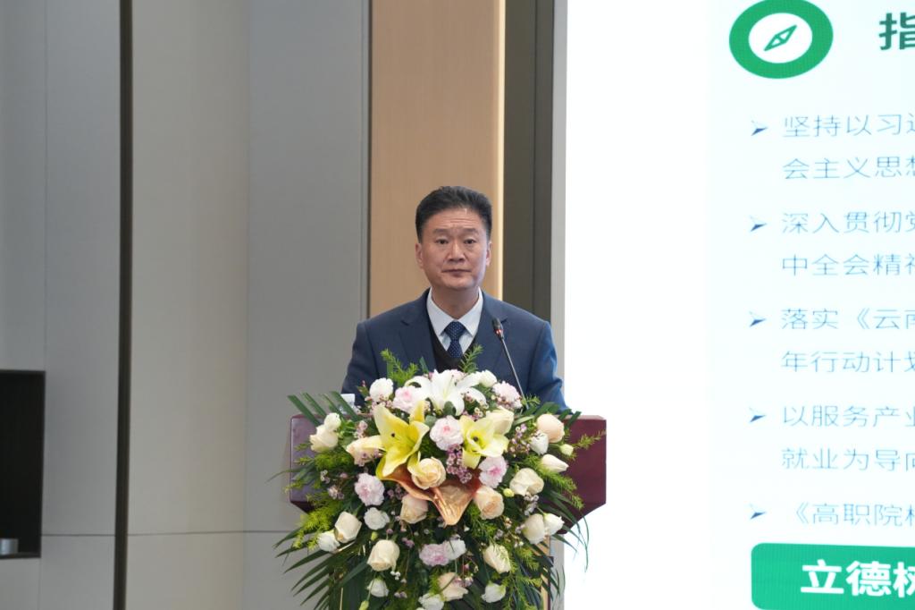 云南康旅教育投资管理有限公司副总经理赵博代表牵头企业、云南康旅控股集团有限公司分享了集团深度参与共同体建设,在实训基地共建、岗位标准开发、技术协同攻关等方面的“康旅路径”与实质性成果,表达了发挥省级国资文旅康养企业资源优势,进一步深化合作、共同推动“大文旅+大康养+大生态”产业布局的意愿。