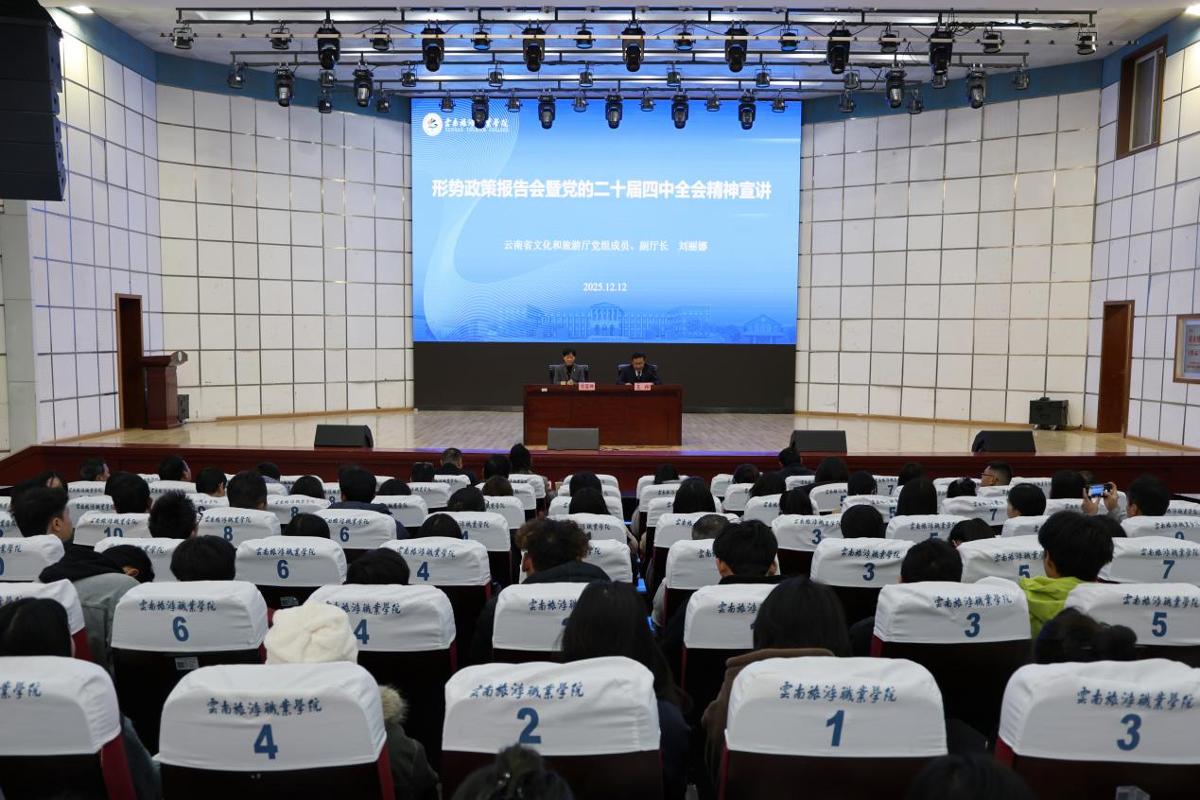 为深入学习贯彻党的二十届四中全会精神,贯彻落实习近平总书记考察云南重要讲话精神,助力文旅产业转型升级和“旅居云南”高质量发展,12月12日下午,我校在报告厅举行“百场形势政策报告会”。本次报告会特别邀请云南省文化和旅游厅党组成员、副厅长刘丽娜作专题讲座。我校党委书记王翔主持报告会。