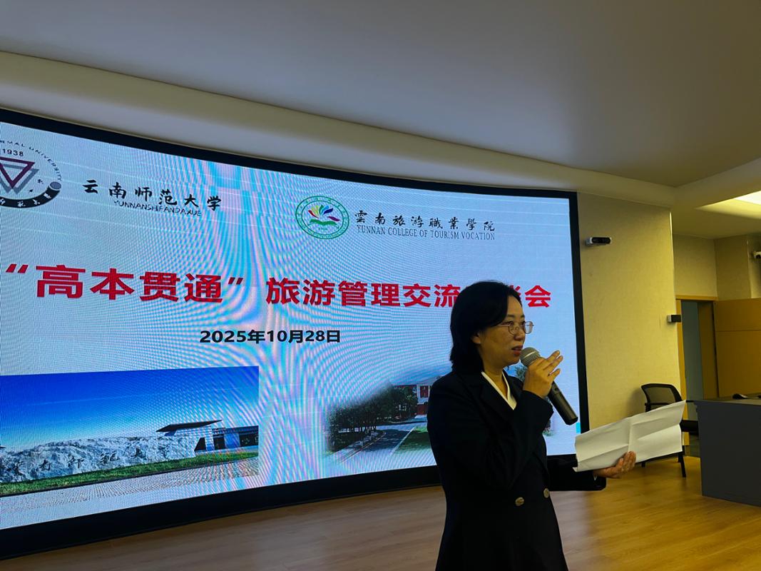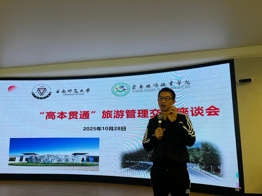 10月28日上午,我校与云南师范大学在图书馆三楼模拟导游厅联合举办旅游管理专业“高本贯通”人才培养交流座谈会。我校党委委员、副院长王霞,旅游管理学院党支部书记伍乐平、院长袁浩镛,云南师范大学管理学院院长李艳、副院长周宁及2024级、2025级旅游管理专业“高本贯通”班学生齐聚一堂,围绕人才培养进行了沟通交流。