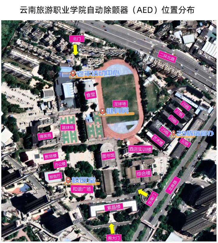 现阶段,实训基地面向全校学生开放选修课程及公益培训项目,着力推动应急救护能力成为我校全体学生的“第二本能”,切实培育“人人会急救,急救为人人”的校园文化氛围。应急救护实训基地还在校园核心公共区域配备4台自动体外除颤器(AED),每台设备旁均设有醒目标识,构建了从“技能学习”到“现场施救”的完整闭环,彰显了我校对师生及游客生命安全的坚定守护与专业保障。