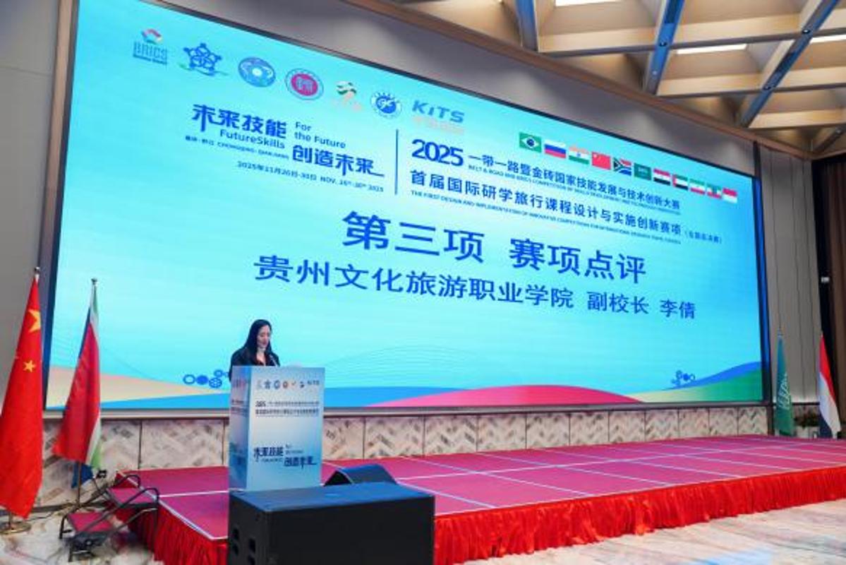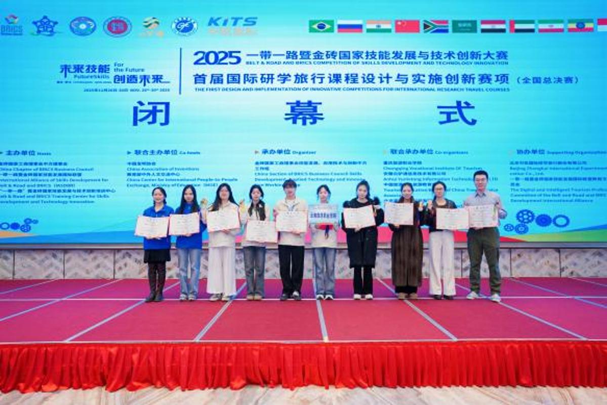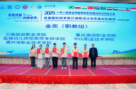 11月26日至29日,2025“一带一路”暨金砖国家技能发展与技术创新大赛之首届国际研学课程设计与实施创新赛项全国总决赛在重庆旅游职业学院圆满落幕。本次大赛汇聚了全国122支参赛队伍、691名师生同台竞技。我校旅游管理学院积极组队参赛,派出1支学生队伍与1支教师队伍出征,最终凭借扎实的专业功底、创新的设计理念与稳定的现场表现,斩获职教组一等奖1项、教师组三等奖1项,指导老师获评“优秀指导老师”,学校荣获“最佳组织奖”,全方位彰显了我院研学旅行专业“师生共育、岗课赛证融通”及国际视野人才培养的实力。