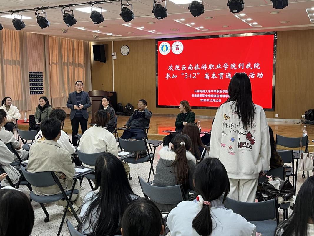 为深化“3+2”高本贯通人才培养项目,搭建校际合作交流桥梁,帮助学生规划好学业发展路径,12月10日下午,我校酒店管理学院师生一行赴云南财经大学中华职业学院开展了一场内容充实、意义深远的交流活动。酒店管理学院副院长陈凌、教师代表及高本2501班全体学生共同参加此次活动。