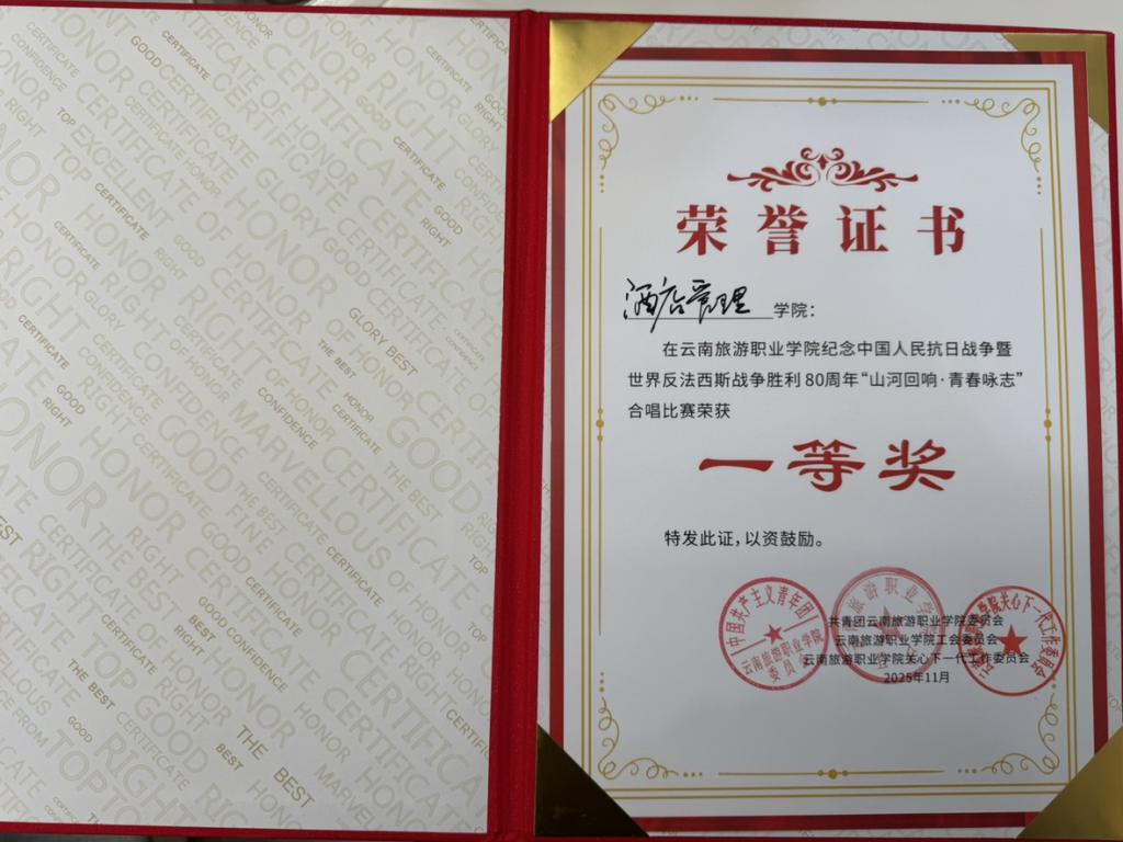 为纪念中国人民抗日战争暨世界反法西斯战争胜利80周年,弘扬爱国主义精神,传承红色基因,我校于近日在学校报告厅成功举办“山河回响·青春咏志”合唱比赛。酒店管理学院代表队以饱满的热情,引吭高歌两首经典曲目,最终以优异的表现,在8个参赛队中脱颖而出,荣获本次比赛一等奖。
