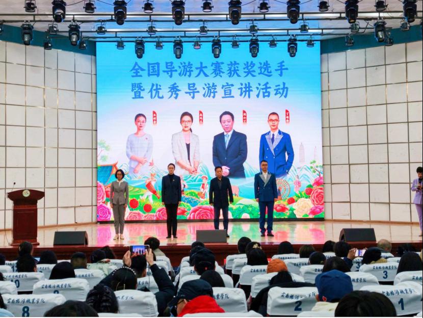 为深入贯彻党的二十大关于“推进文化和旅游深度融合发展”的重要部署,落实“以赛促训、以赛提质”工作要求,引导学生近距离学习行业先进经验,提升专业素养与职业认知,2026年1月10日,“助力个人成长·树牢职业自信——全国导游大赛获奖选手暨优秀导游宣讲活动”昆明站在我校顺利举办,旅游管理学院组织百余名师生代表前往现场观摩学习,在与全国顶尖导游的交流互动中汲取专业智慧,明晰成长方向。