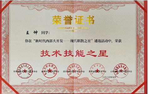 本次评选活动以“赋能西部发展、培育职教英才”为核心,旨在发掘新时代职业教育领域的优秀学子与创新实践成果,为新时代西部大开发战略注入职教力量。评选过程中,评审专家组围绕专业技能水平、实践应用能力、综合素质发展等多维度进行严格考核。龚均、王坤两位同学凭借在校期间的专业技能与学科竞赛,最终斩获殊荣。此次评选全省仅60人入选。