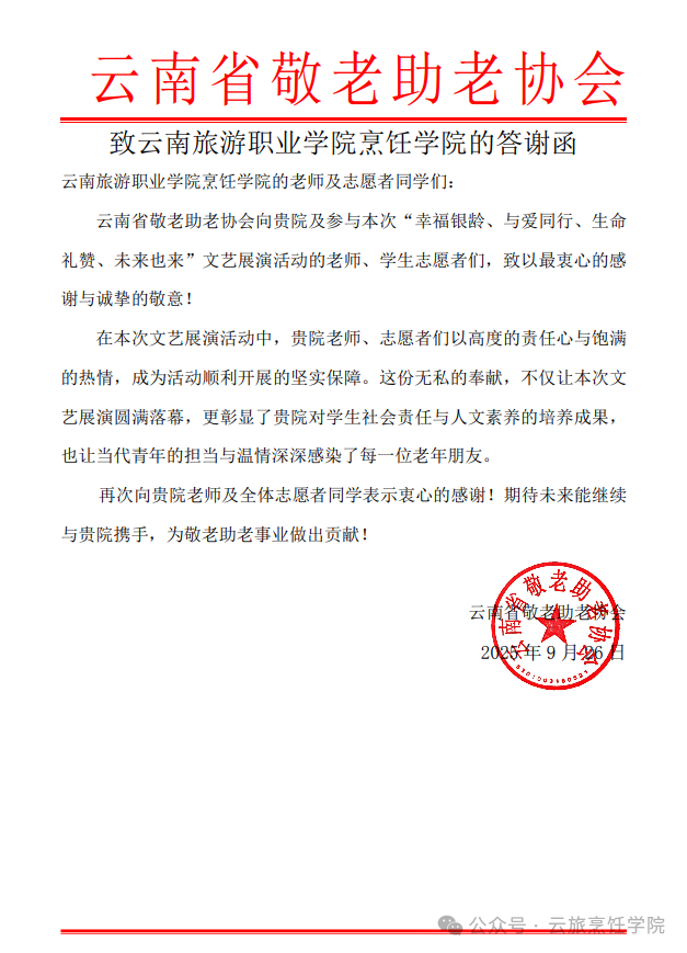 2025年8月25日,烹饪学院15名学生志愿者,应云南省敬老助老协会邀请,参与了“幸福银龄,与爱同行”公益宣传展演活动。