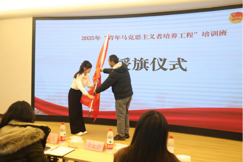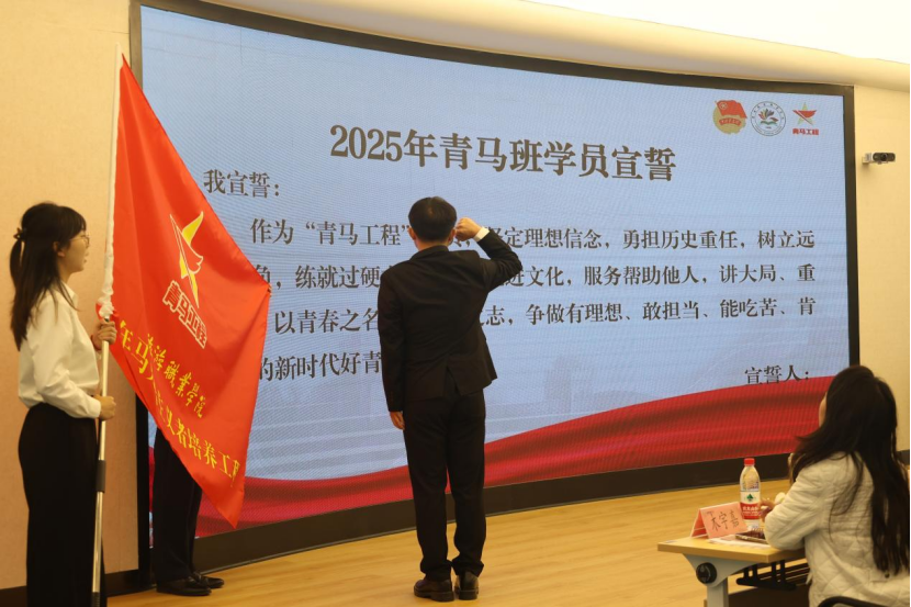随后,学院党委副书记王敏为2025年“青马工程”培训班授旗。学员代表史俊勇带领全体学员庄严宣誓,充分展现了学员们立志成为马克思主义的坚定信仰者、忠诚实践者和民族复兴伟业中奋勇搏击者的坚定决心与昂扬斗志。