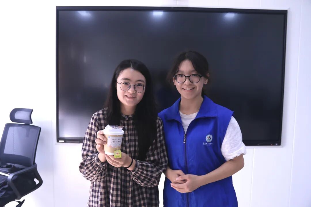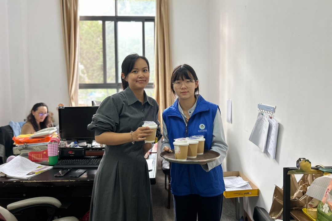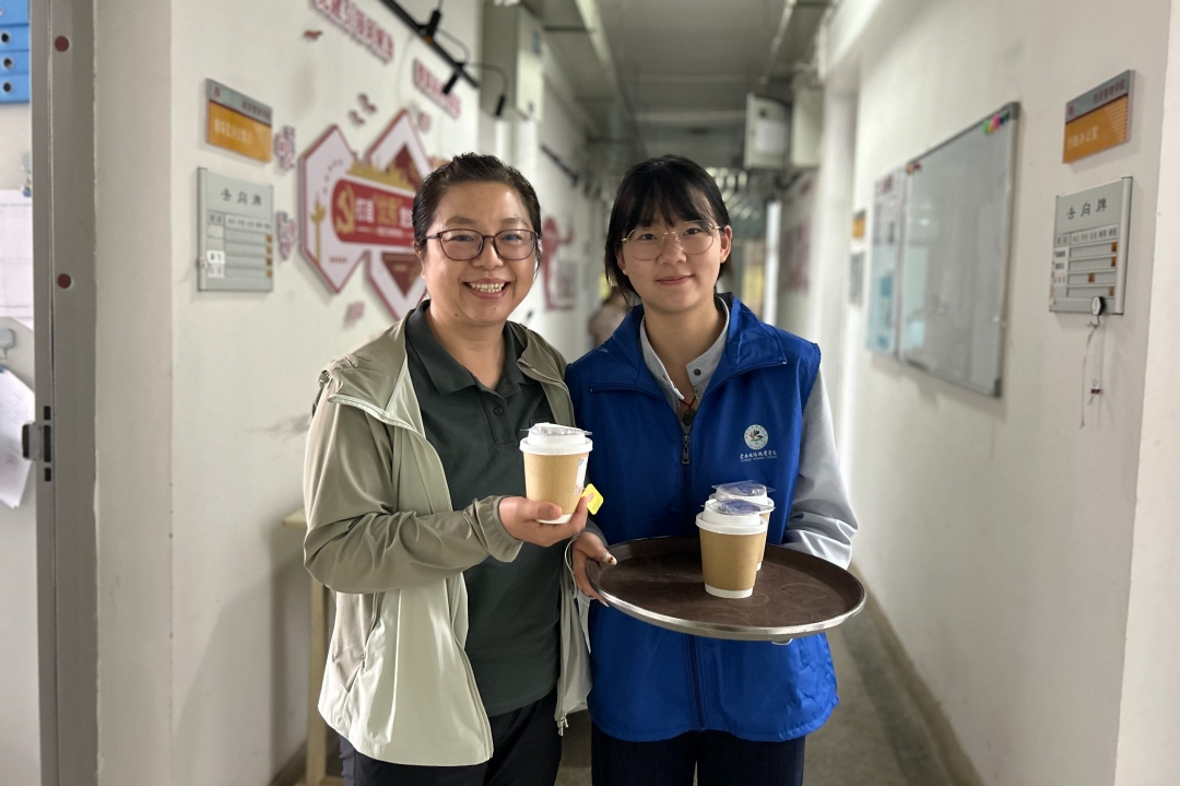 教学楼前,青年志愿者把一杯杯情意满满的清茶、咖啡递到老师手中。一杯清茶,致敬师者沉淀岁月的温润匠心;一杯咖啡,传递学子真挚涌动的青春敬意。