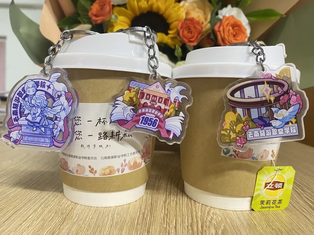 随杯附赠的是由我校学生社团“绮梦绘界插画社”原创设计的云旅文创钥匙扣,设计融合了校园文化元素,紫晶楼、期待雕像、环形校门等标志性建筑一一呈现,每一款设计都承载着学子对校园文化的认同和对老师们诲人不倦的深切感激,把青年学子眼中的云旅“装”进老师的公文包里。