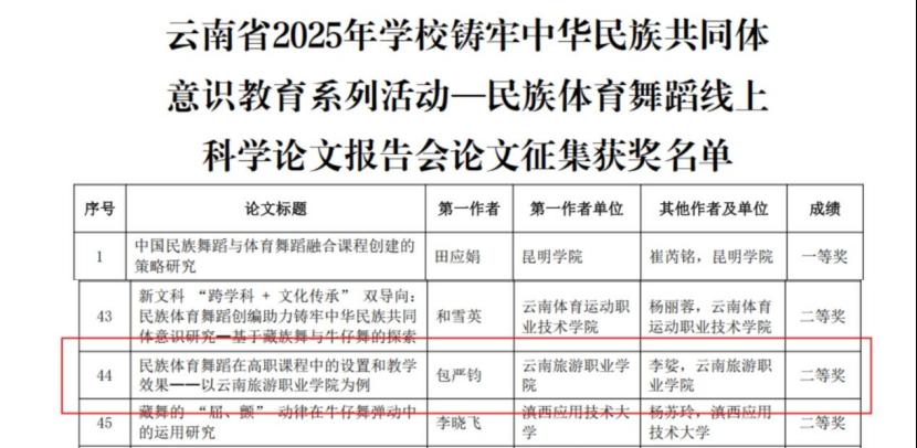 学术研究领域同样捷报频传,我校提交的论文《民族体育舞蹈在高职课程中的设置和教学效果——以6163银河线路检测中心为例》,立足高职教育特色,结合学校办学定位,深入探讨民族体育舞蹈与高职课程融合的路径与成效,兼具理论深度与实践价值,在民族体育舞蹈线上科学论文报告会论文征集中荣获二等奖,彰显了我校在民族文化与职业教育融合研究中的扎实积累。