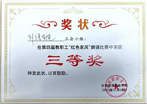 此次获奖是对外语学院全体教职工文化素养与精神风貌的充分肯定。外语学院将继续加强文化建设,鼓励广大师生传承红色经典,弘扬优良家风,以更加昂扬的姿态推进各项工作,为学院发展注入更加强劲的精神动力。