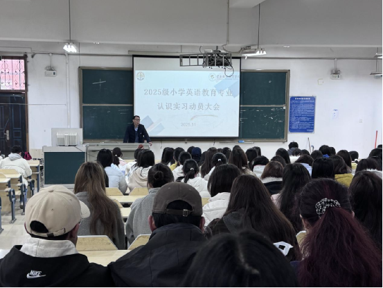 为夯实小学英语教育专业人才培养根基,助力新生筑牢职业认知、涵养专业素养,2025年11月24日至28日,外语学院组织2025级小学英语教育专业全体学生,开展了为期五天的专业认识实习。作为大学生入学后的首次专业实习,此次实习以“初识教坛、锤炼技能、培育初心”为核心,搭建“校校衔接”的实践桥梁,组织全体新生走出大学校园、沉浸式走进小学校园的课堂,助力专业新生完成从“学生”到“准教师”的角色认知转变。在动员大会上,外语学院党政负责人重点强调了生命财产、交通、食品、防诈骗、意识形态等安全问题,明确实习底线并围绕“做什么、怎么做、达何效”,解读了实习环节与目的,为新生高效参与实践划定目标、筑牢保障。