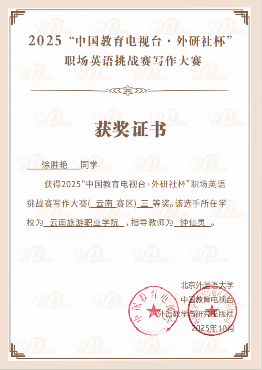 本次比赛共有全省30多所高职院校的89名选手参与,比赛通过“iTEST智能测评云平台”在线进行。经过激烈角逐,我校旅游英语专业2302班徐胜艳同学凭借扎实的语言功底荣获三等奖,充分展现出旅游英语学子的专业能力与青春风采。