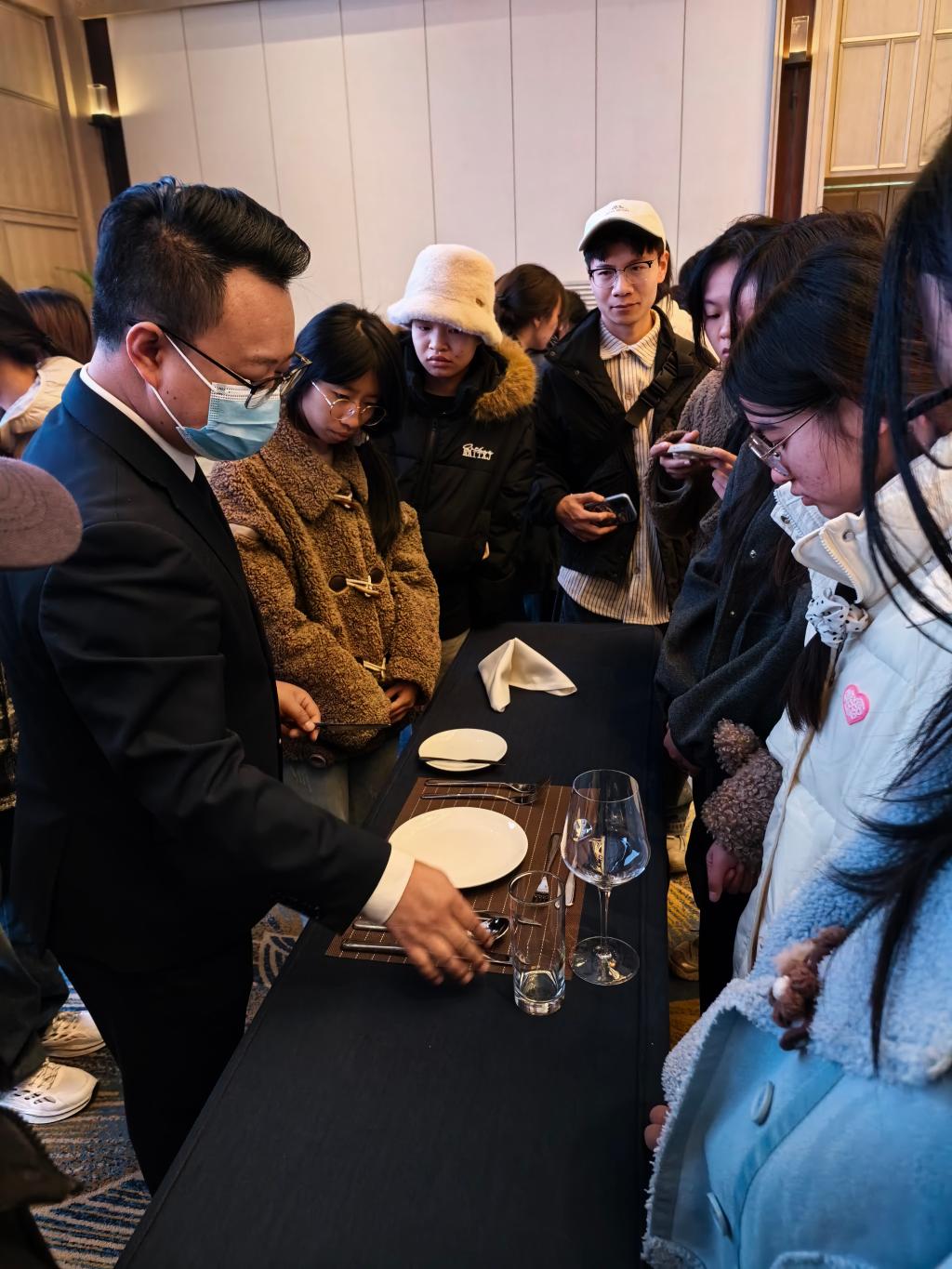 12月3日下午,学生们在昆明喜来登酒店实习,实地了解酒店的管理模式及各部门的工作职责。学生们实操了餐桌摆台及客房卫生清洁。通过此次学习和实操,学生们对国际酒店的运营和岗位要求有了更直观地了解和体验。