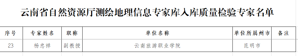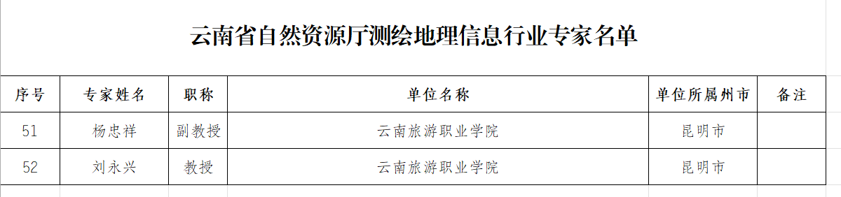 近日,云南省自然资源厅公布测绘地理信息专家库入库专家名单,我校资源工程学院杨忠祥副教授(同时入选行业专家和质量检验专家)、刘永兴教授成功入选,跻身云南省测绘地理信息领域专家行列。